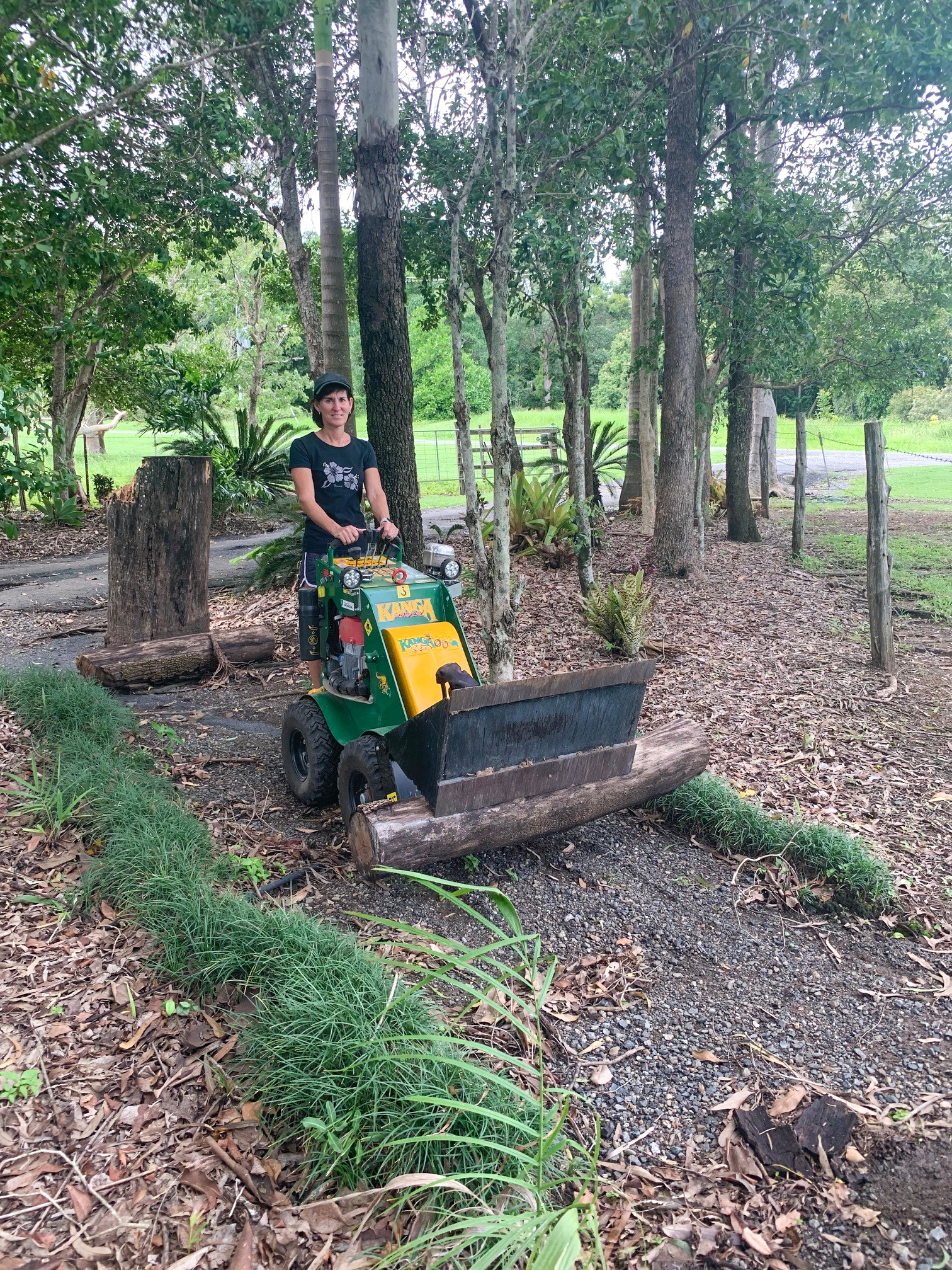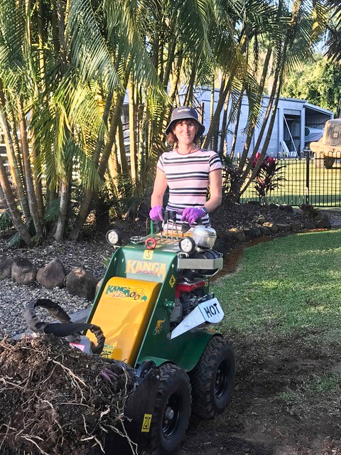 Kerry McKeering bought her first ever Kanga about 9 months ago. She enjoys working on her garden and her 2-acre land provides the ideal conditions for exciting landscaping projects. Having injured herself previously by lifting rocks and other material, she decided to get some help and bought a Kanga. Kerry and her husband went to look at the different Kanga models at a field day and decided that the Kanga Kid would be the most suitable machine. “I never looked at other mini loader brands, as I used to borrow a Kanga from our neighbours to do some garden work. I found that it was a great machine”, she says. Kerry’s Kanga Kid and her 4 in 1 bucket help her shift wood chip, pebbles, logs and crusher dust. She also uses it for digging up and levelling ground. “I use it all the time, sometimes I am on it every day, when the weather is fine and I’m working on a project. I am passionate about my garden and love working with my Kanga. It is perfect in size, it is easy to use and ideal for the narrow pathways on our piece of land. Getting onto the machine and learning how to operate it, was a little daunting at first. But the Kanga Kid is so easy to use and very comfortable to operate.”